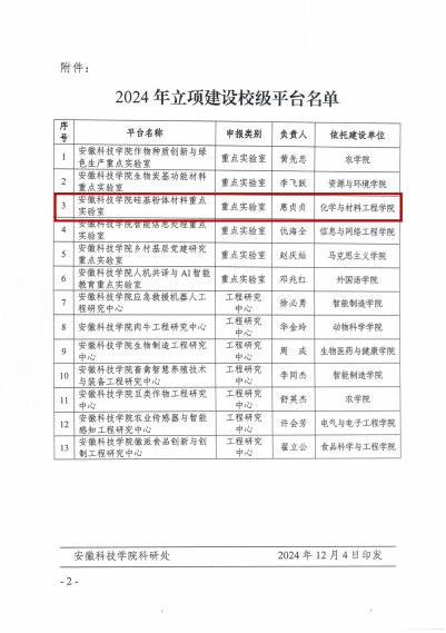 安徽科技学院硅基粉体材料重点实验室的研究方向与材料与化工学科发展需求高度契合,是学科建设的重要依托平台。当前组建的安徽科技学院硅基粉体材料重点实验室人员主要来自材料与化工安徽省应用型高峰培育学科,该学科在安徽省硅基产业领域具有领先地位,在功能粉体材料制备技术与应用、绿色环保材料等综合利用和光伏器件研发等方面具备领先技术,为我省硅基新材料项目的实施提供了重要的技术保障。
