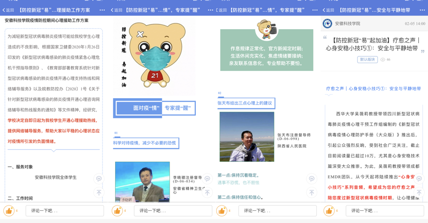 构建全方位的宣传体系,开设“防控新冠易起加油”版块,自1月25日起不间断推送各类疫情防控专题帖50余篇,介绍全国疫情防控形势,个人疫情防控知识,以及学校疫情防控工作部署安排,积极宣传抗疫一线的感人事迹。发起线上“我是安科学子—“易”起承诺”活动,承诺疫情期间科学防控,不传谣不信谣,学习预防并重,绝不提前返校。推送《安徽科技学院致全体师生员工一封信》《同舟共济战疫情——致湖北籍大学生的一封信》,有效凝聚起众志成城、共克时艰的强大正能量。