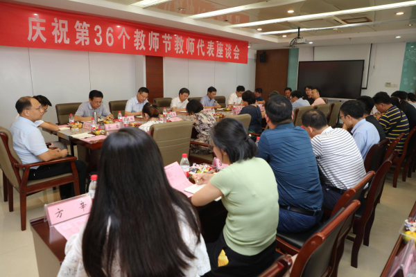 9月9日下午,学校在新图书馆十楼会议室召开庆祝第36个教师节教师代表座谈会。校党委书记蒋德勤,党委副书记、校长李震,党委委员、副校长黄远友,党委委员、纪委书记王强,党委委员、副校长黄友锐,党委委员、副校长李升和出席座谈会,党委(校长)办公室、教务处、党委教师工作部(人事处)、科研处、国有资产管理处、财务处、实验室与实践基地管理处、后勤保障部负责人及教师代表22人参加座谈会。座谈会由黄远友主持。