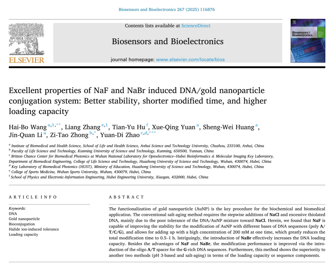 近日,我校生命与健康科学学院王海波博士(第一/通讯作者)在生物传感领域国际顶级期刊《Biosensors & Bioelectronics》(中国科学院一区Top期刊,影响因子:10.7,CiteScore:20.80)在线发表了题为“Excellent properties of NaF and NaBr induced DNA/gold nanoparticle conjugation system: Better stability, shorter modified time, and higher loading capacity”的研究成果,DOI: 10.1016/j.bios.2024.116876。该论文第一单位为安徽科技学院,昆明理工大学钟子涛博士和华中科技大学赵元弟教授为共同通讯作者。本研究在安徽省教育厅重点项目(2023AH051869)、安徽科技学院引进人才项目(200181)以及安徽雪郎生物科技股份有限公司的经费资助下完成。