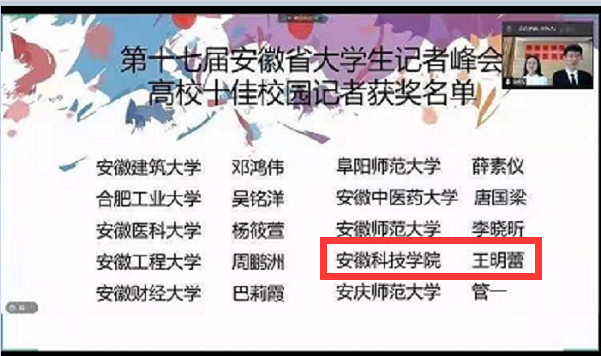 12月26日,以“‘后浪’奔涌,薪火承志”为主题的第十七届安徽省大学生记者峰会圆满落幕,本次会议采取腾讯会议线上举行,峰会对2020年度全省高校优秀新闻作品进行了表彰,我校新媒体中心再续辉煌,再次诞生全省“十佳校园记者”一名,言论类作品首次实现一等奖的突破。