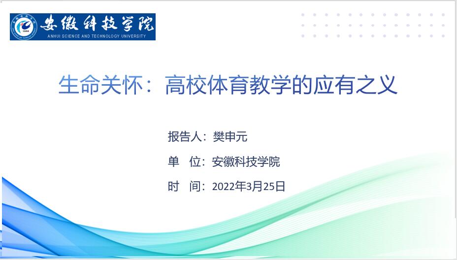 3月25日,我校体育教学部樊申元老师参加了第十二届全国体育科学大会线上会议,并在“学校体育创新发展的理论与实践”专题会场作了题为“生命关怀:高校体育教学的应有之义”的专题报告。