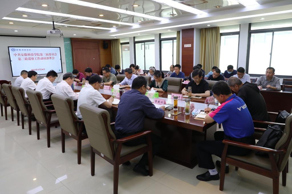 5月26日下午,中共安徽科技学院第三届委员会第三轮巡察工作动员部署会召开。校党委书记、巡察工作领导小组组长蒋德勤作动员部署讲话。会议由校党委委员、纪委书记、监察专员王强主持。学校党委巡察工作领导小组成员,党委巡察办、巡察组全体成员,党委组织部、纪委办主要负责同志,被巡察单位党政主要负责人及联络员参加了会议。