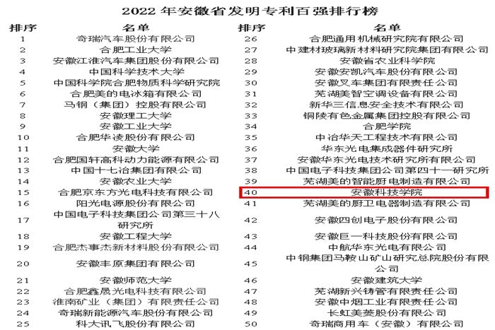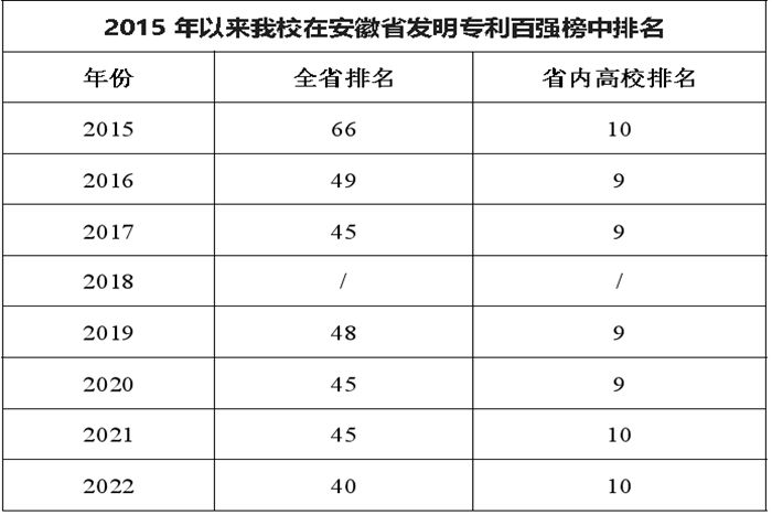 1月28日,安徽省市场监督管理局、省教育厅、省科技厅和省经济和信息化厅联合发文公布了2022年安徽省发明专利百强排行榜。我校综合排名全省第40位(位列全省高校第10位),排名创历史新高。这是自2015年安徽省首次发布发明专利百强榜以来,我校第七次上榜。