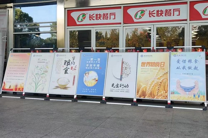 开展线下学习宣传活动,体验式交互交流。为提升广大师生参与感,学院在西区食堂入口及学生来往较多的广场处设立专栏,宣传推介典型案例,讲好中国粮食故事,并开展了签名活动。“一粒米的故事”以形象生动的漫画形式展现了粮食的来之不易,“节约粮食”“光盘行动”“爱惜粮食,从我做起”的标语深入人心,来往师生在签名墙上郑重地写下自己的姓名,成为保护粮食安全的践行者之一,营造了爱粮节粮的浓厚氛围。