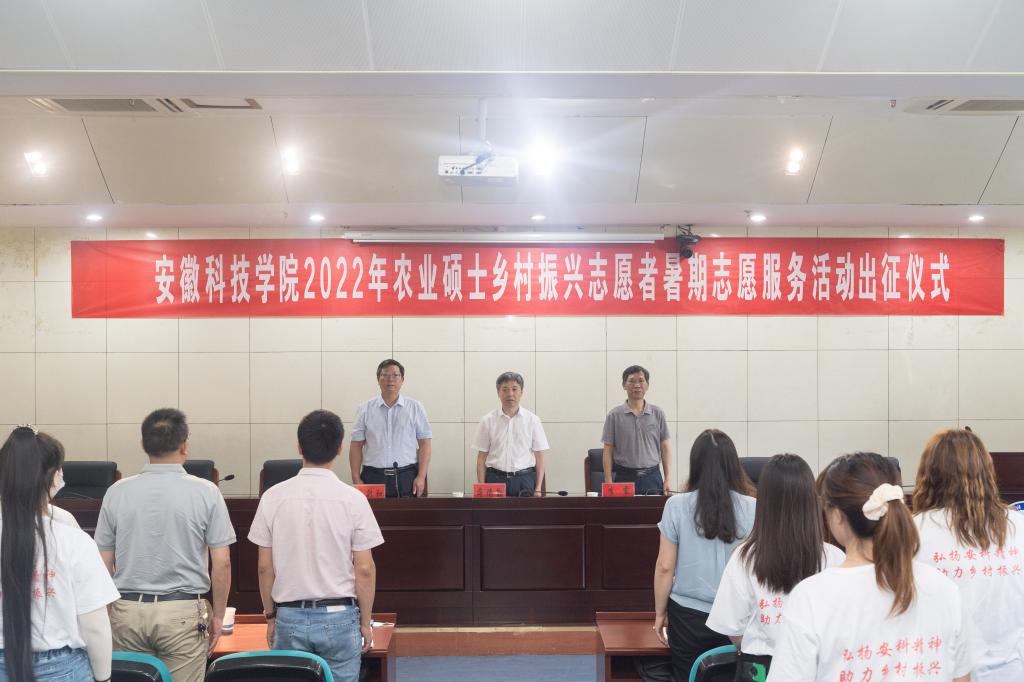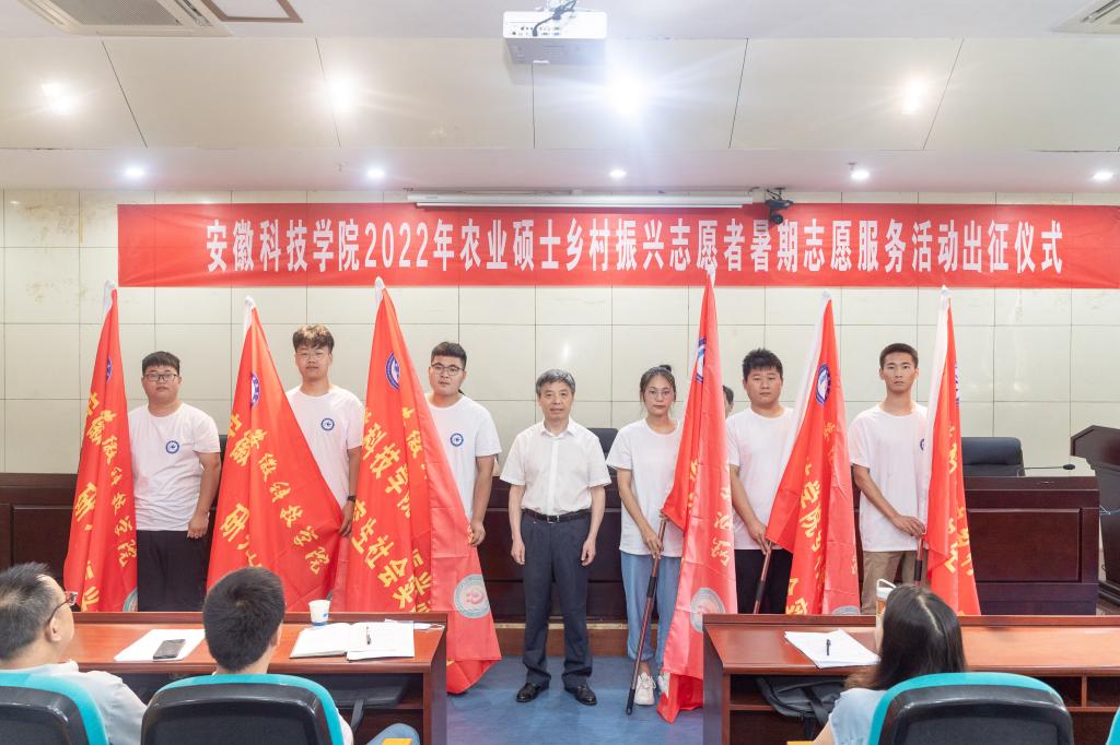 蒋德勤宣布安徽科技学院2022年农业硕士乡村振兴志愿者暑期志愿服务活动正式启动,并为12支暑期志愿服务团队授旗。同时,他对各志愿服务团队提出了殷切希望,寄语美好祝福。