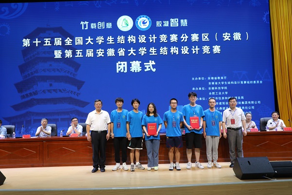 6月27日下午,由安徽省教育厅、安徽省大学生结构设计竞赛组织委员会主办,安徽科技学院、合肥工业大学承办的第十五届全国大学生结构设计竞赛分区赛(安徽)暨安徽省第五届大学生结构设计竞赛在我校龙湖校区图书馆东辅楼报告厅圆满闭幕。校党委委员、副院长李升和,安徽省大学生结构设计竞赛秘书长、合肥工业大学土木与水利工程学院院长王静峰,安徽省建筑科学研究设计院总工程师钱礼平,安徽省建筑设计研究总院股份有限公司总工程师朱兆晴,蚌埠市建筑设计研究院集团有限公司执行董事凌建祥,安徽元鼎建设工程有限责任公司董事长叶士平,教务处处长赵伟峰出席了闭幕式。仪式由建筑学院院长张远兵主持。