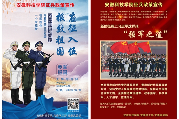媒体矩阵发力,强化宣传引导。党委学工部、人民武装部联合党委宣传部、校团委、招生就业处和各学院通过悬挂宣传条幅,利用易班、网站、公众号、大屏幕、“两微一端”平台发力,精准推送2022年征兵公益宣传片《火热军营精彩人生》,弘扬热血青年追逐青春梦想、投身强军兴军的家国情怀,引导学生响应祖国号召、携笔从戎,到军营建功立业。