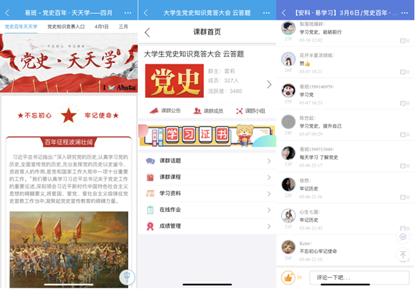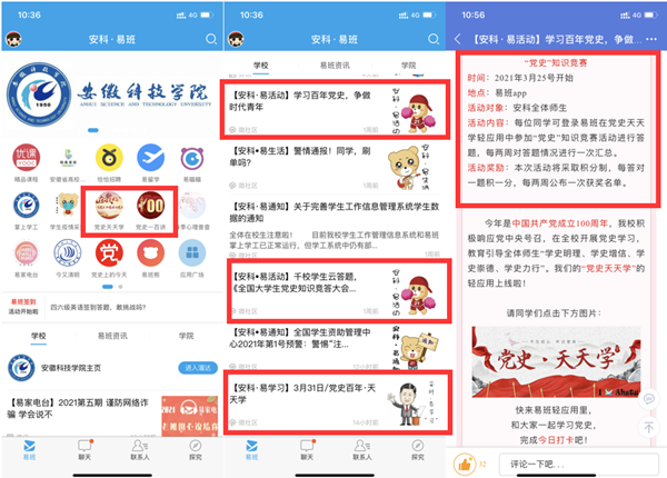 风雨百年,鉴往知来。为深入贯彻落实习近平总书记在党史学习教育动员大会上的重要讲话精神,落实《安徽科技学院“永远跟党走”学生党史学习教育方案》,切实增强学生党史学习教育的针对性、实效性,我校易班积极打造党史教育“云课堂”。