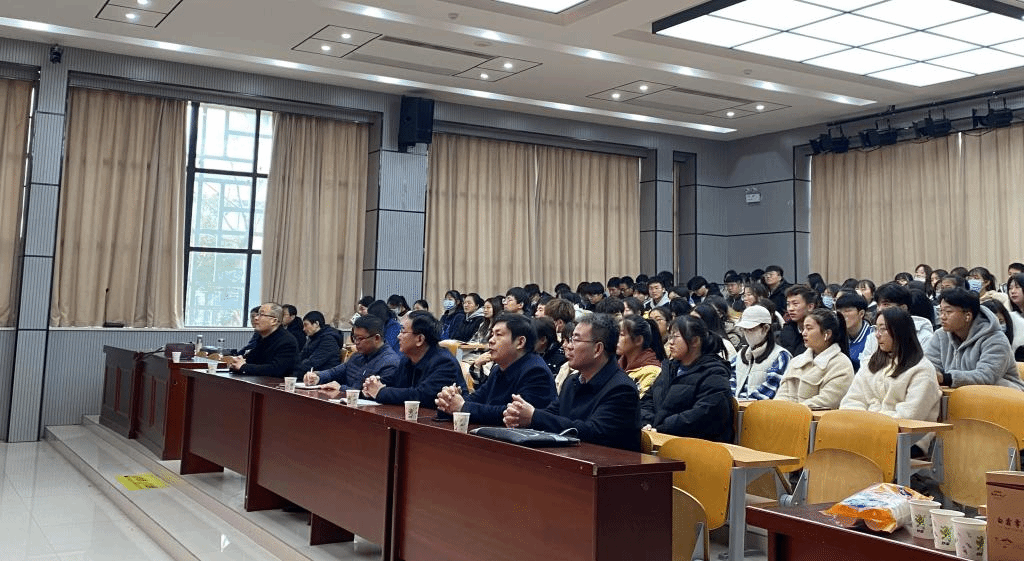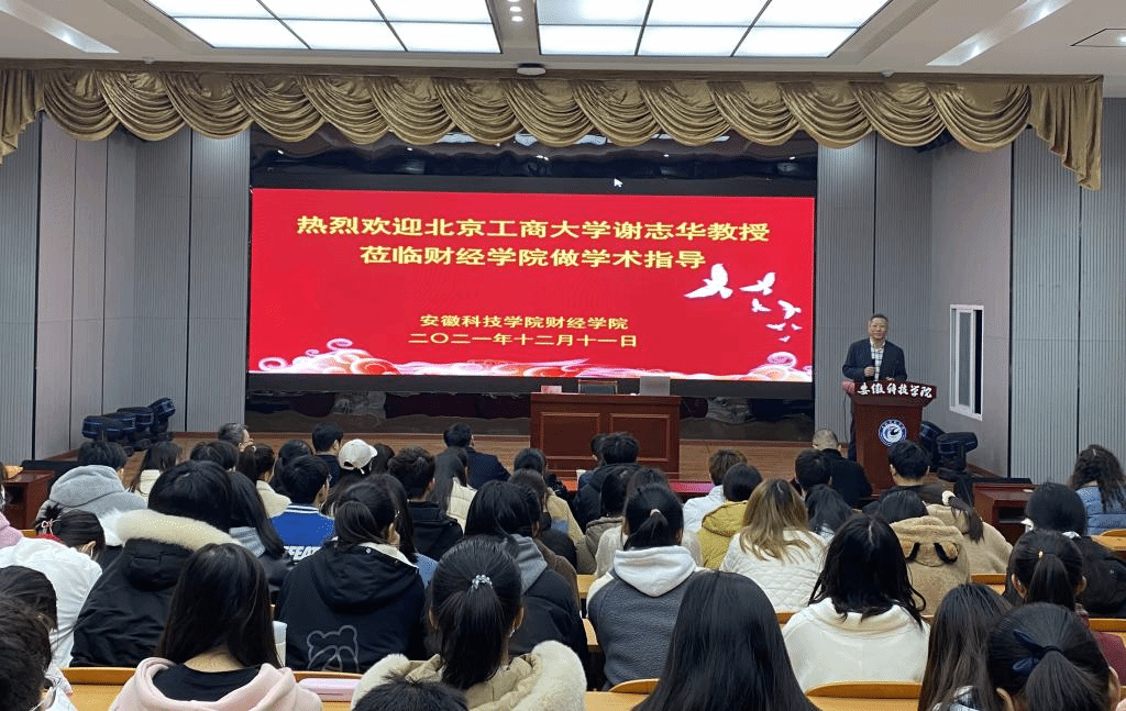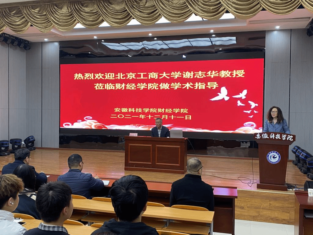 2021年12月11日上午,北京工商大学原副校长、现任教育部工商管理学科指导委员会副主任委员谢志华教授应邀莅临我校财经学院指导新商科专业建设,安徽财经大学会计学院院长翟胜宝教授随行指导。谢志华在敏行楼A一楼报告厅做了题为“新技术与新商科”的学术讲座,安徽科技学院党委委员、副校长黄友锐、教务处处长赵伟峰、财经学院党政领导和全体教职工以及2021级会计学、2021级金融工程专业学生参加报告会。财经学院院长郝世绵主持报告会。