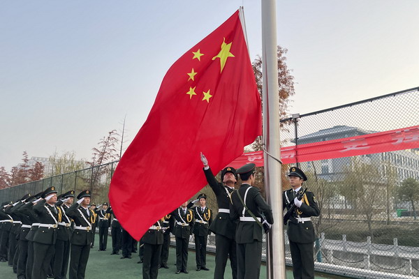 6时40分,升旗仪式正式开始。国旗护卫队的队员们迈着整齐的步伐,护送国旗入场。伴随着义勇军进行曲的旋律,鲜艳的五星红旗徐徐升起,全体人员面向国旗行注目礼,共同祝愿祖国繁荣昌盛。“漫长的岁月,我吞忍了多少难忍的煎熬,但理想之光,依然在心中灼灼闪耀。我变成了一块煤,还悲愤的捶打地狱的门环,祖国啊,祖国啊,我要燃烧!地壳是多么的厚啊,希望是何等的缥缈!我渴望,渴望面前闪出一千条向阳坑道!我要出去,投身于熔炉,化作熊熊烈火:祖国啊,祖国啊,我要燃烧——”国旗护卫队魏江北同学带来的诗词朗诵《祖国啊,我要燃烧》深情表达了对祖国的无比热爱之情,展现了青年一代勇担重任、奋力拼搏的积极向上的精神。