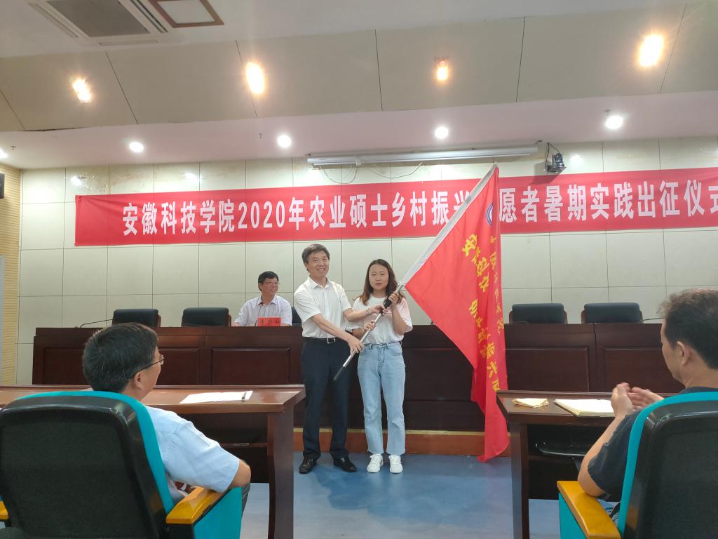 蒋德勤宣布安徽科技学院2020年农业硕士乡村振兴志愿者暑期实践活动正式启动,并为7支研究生志愿者实践团队授旗。同时,他对各实践团队提出了殷切希望,寄语了美好祝福。