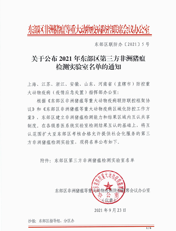 9月23日,由上海、江苏、浙江、安徽、山东、河南等五省一市组成的东部区非洲猪瘟等重大动物疫病防控联席会议办公室《关于公布2021年东部区第三方非洲猪瘟检测实验室名单的通知》,公布了2021年东部区第三方非洲猪瘟检测实验室名单,我校动物医学实验中心名列其中。文件指出,在非洲猪瘟等重大动物疫病联防联控框架协议和区域化防控工作方案指导下,东部区建立非洲猪瘟检测能力和结果区域内互认共享制度。在各级兽医系统实验室检测结果互认的基础上,将互认范围扩大至东部区考核合格允许提供社会化服务的第三方非洲猪瘟检测实验室。