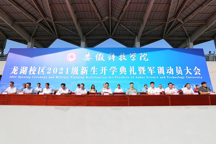9月22日上午,我校龙湖校区2021级新生开学典礼暨军训动员大会在南田径场隆重举行。校党委副书记、校长李震,陆军装甲兵学院蚌埠校区学员九大队副大队长、龙湖校区军训团团长王博杨,党委委员、副校长黄远友,党委委员、纪委书记、监察专员王强,党委委员、副校长黄友锐,党委委员、副校长李升和出席大会并在主席台就座。校党委书记蒋德勤因公出差在外地,不能参加开学典礼,特致电向全体新同学表达诚挚问候和美好祝愿,祝同学们学业有成,健康快乐。学校各学院党政主要负责人、军训领导组成员、有关部门负责同志等参加大会。大会由黄友锐主持。