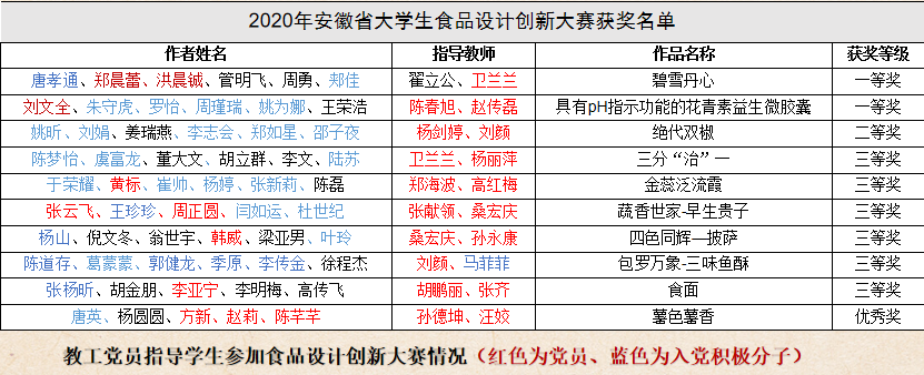 教工党支部与学生党支部虽然在党建工作中角色定位不同,但党建总体目标是一致的。食品教工党支部以相关活动为载体,通过师生党员结对参加创新创业竞赛、师生党支部共同开展主题教育活动等多种形式,拉近师生之间的距离,增进师生党员之间的感情,打造亲密融洽的师生关系,助推学院事业发展。学院在2020年安徽省大学生食品设计创新大赛中共获一等奖2项、二等奖1项、三等奖6项、优秀奖1项,全部获奖项目均有教师党员参与指导。学院在2020年中国(安徽)大学生茶文化创新大赛中两个项目分获团体和个人赛三等奖,全部由教师党员担任指导老师。