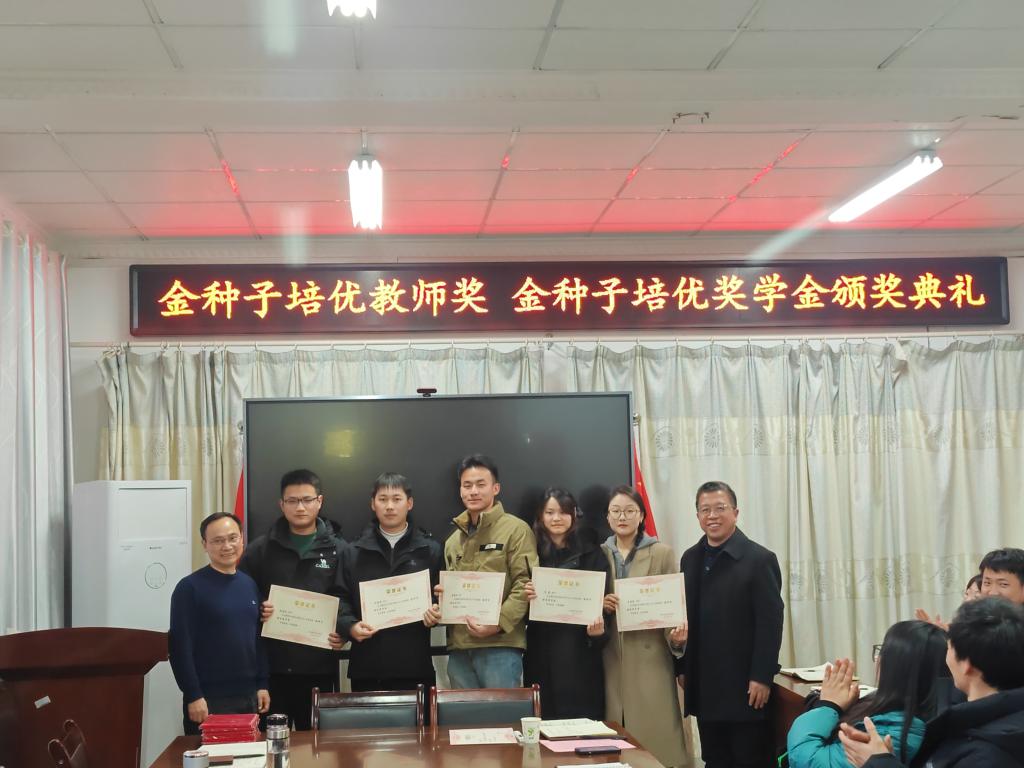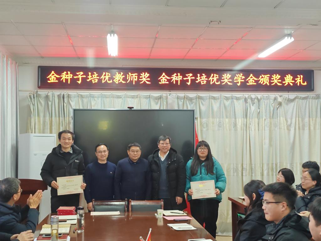 1月11日下午,“金种子培优基金”2023年度“金种子培优奖学金”“金种子培优教师奖”颁奖仪式在农学院会议室隆重举行。校党委委员、副院长李升和,上海景领投资管理有限公司合伙人、基金发起者黄宪先生,二级教授、基金发起者农学院黄先忠老师,农学院党委书记何世潮,副书记张轶辉,副院长舒英杰和李文阳以及教师代表和学生代表出席颁奖仪式。根据《安徽科技学院农学院“金种子培优基金”申报细则》和申报人申请,经“金种子培优基金”评审委员会评审,李瑞宁、艾昊两位青年教师荣获金种子培优教师奖,孙张论、李婷、杜孟祥、杨德坤和王静婷五位农艺与种业专业研究生荣获金种子培优奖学金。颁奖仪式由农学院党委副书记、院长崔广荣主持。