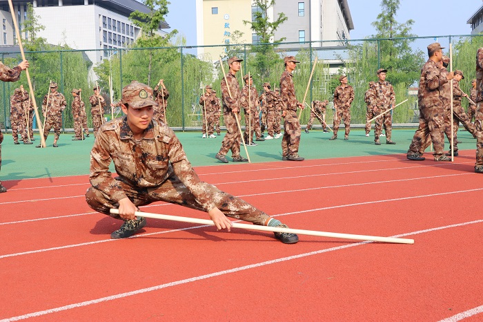 “嘿!哈!一!二!”伴随着铿锵有力的呐喊,行云流水般的动作,英气十足的少年们挥舞着木棍一展风发的意气。棍法方阵是训练难度较大的方阵之一。为了队伍的整齐划一,教官对同学们是高标准,严要求,反复训练,直到整齐为止。面对高强度的训练,同学们没有丝毫怨言,全都聚精会神地观察着教官的标准动作,一招一式力求精准流畅。建筑学院风景园林202班的黄朝阳说道,棍法是他们最近一直不断练习的,他觉得最困难的事就是每个人的动作难以做到整齐划一。从开始的歪七斜八到现在的整齐划一,他感慨到,想要取得成果,不仅需要每个人的付出,更需要同学们之间,团结合作,将集体意识牢牢心间。