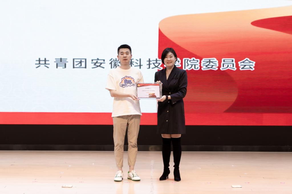 宣讲中,校团委书记张聪为许胜胜颁发了安徽科技学院大学生就业“引航员”聘书。(特约通讯员:张古品 摄影:杨天鹏 吴萍青 审核:李刚 姚文均 编辑:李锦)