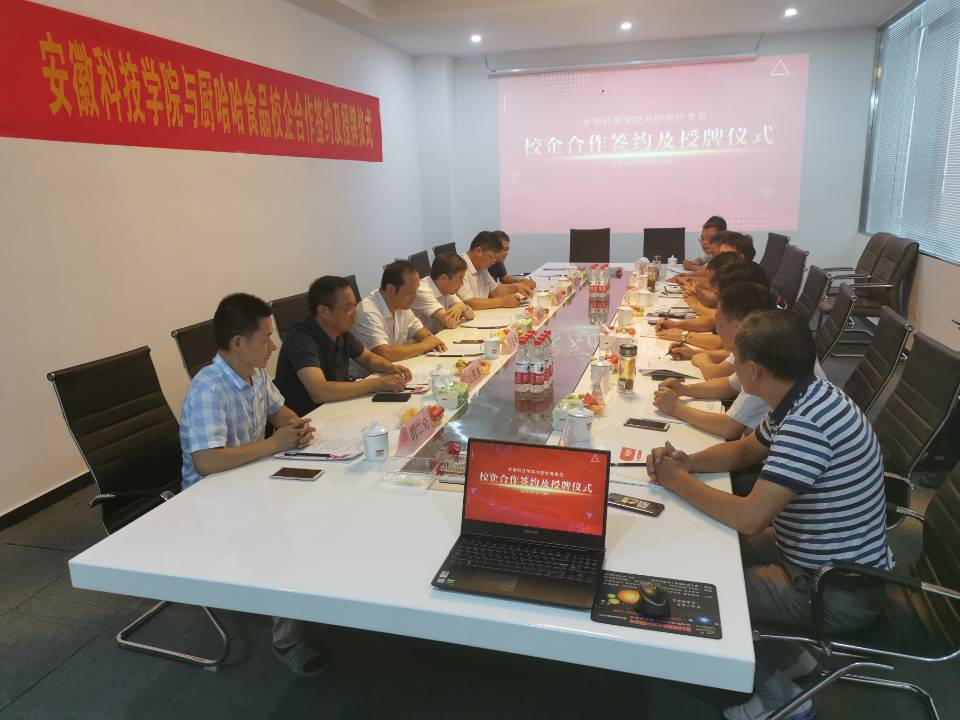 仪式上,蒋德勤向安徽厨哈哈食品科技有限公司颁授了安徽科技学院产学研合作基地、安徽科技学院研究生联合培养基地牌匾。校企双方分别签署了校企产学研合作协议、研究生联合培养基地合作协议和宅食技术合作协议。