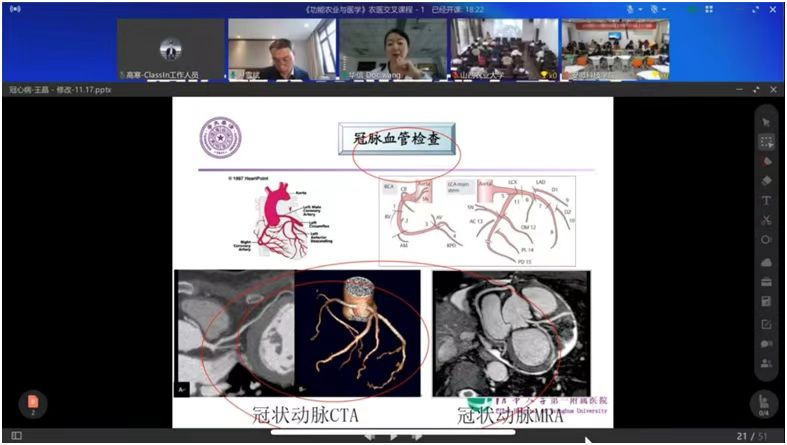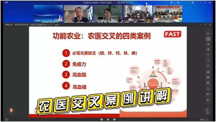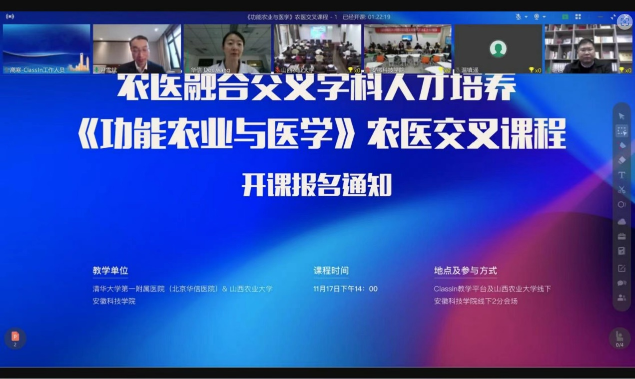 近日,我校与清华大学第一附属医院、山西农业大学合作举办了农医融合交叉学科人才培养课程首次授课。该课程由清华大学第一附属医院心血管内科副主任医师王晶、安徽科技学院长三角功能农业(食品)研究院院长尹雪斌教授联合讲授。这也是《功能农业与医学》农医融合交叉第一课。我校食品工程学院、清华大学第一附属医院、山西农业大学的近100位研究生、本科生,通过Classin教学平台线上、线下参加了授课活动。