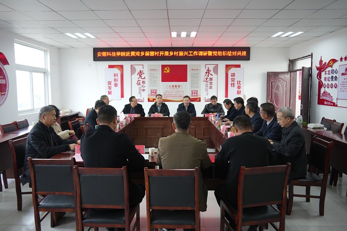 为实地调研学校定点帮扶村乡村振兴工作开展情况,以实际行动学习宣传贯彻党的二十大精神,在校地党组织结对共建中将党的二十大精神落到实处,11月25日下午,校党委委员、副院长黄远友带领机关各职能部门主要负责人(各党支部书记)赴凤阳县黄湾乡吴窑村开展定点帮扶村乡村振兴工作情况专题调研及机关党委与吴窑村党总支结对共建活动。