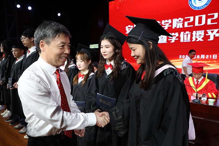 面对即将开启人生新旅程的广大毕业生,李震提出三点殷切希望。一是希望广大毕业生坚定信念,找准目标定位,做一名矢志报国的人。要胸怀“国之大者”,带着深厚的家国情怀,坚定理想信念,与党心连心,与国家同行,与时代共舞,在民族复兴和国家富强中找准目标定位,在人民幸福和人类进步中创造辉煌。二是希望广大毕业生知行合一,敢于直面挑战,做一名能担重任的人。要牢记习近平总书记“用脚步丈量祖国大地,用眼睛发现中国精神,用耳朵倾听人民呼声,用内心感应时代脉搏”的殷殷嘱托,在实践中增长知识、锤炼品格,在工作中增长才干,将“艰苦奋斗、开拓创新、求真务实、无私奉献”的安科精神传承好、发扬好。三是希望广大毕业生自强不息,懂得诚信分享,做一名品格高尚的人。他希望毕业生们继续关注支持学校发展,记得常回家看看。