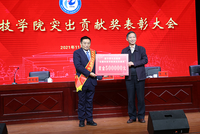 会上,黄远友宣读了《中共安徽科技学院委员会关于授予黄先忠同志优秀共产党员称号的决定》,李升和宣读了《关于授予黄先忠教授安徽科技学院突出贡献奖的决定》,蒋德勤为黄先忠教授颁发荣誉证书,李震为黄先忠教授颁发奖金,农学院党委书记何世潮代表学院作了发言。