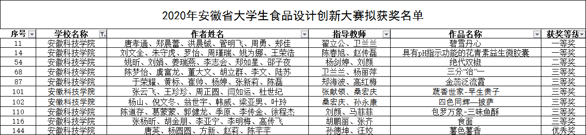 2019年 “凤宝杯”安徽省大学生食品设计创新大赛,学院有十件参赛作品被推选参加“凤宝杯”安徽省大学生食品设计创新大赛,获一等奖4件、二等奖3件、三等奖1件。2020年 “三只松鼠杯”安徽省食品设计创新大赛,学院参赛作品共获一等奖2项,二等奖1项,三等奖6项,优秀奖1项。