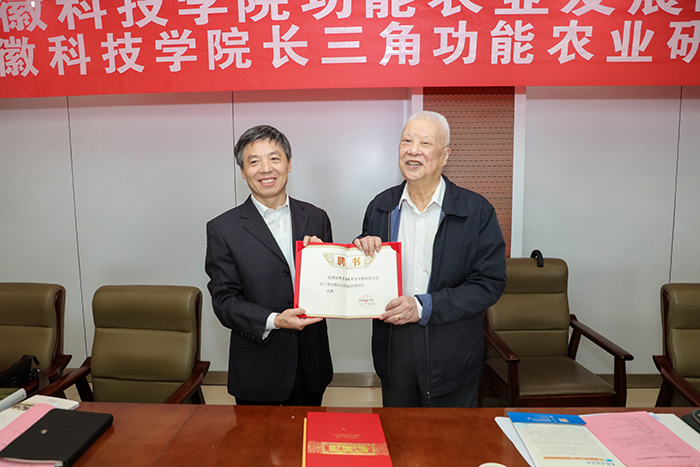 赵其国和蒋德勤共同为安徽科技学院长三角功能农业研究院揭牌。赵其国欣然接受蒋德勤为其颁发的“安徽科技学院长三角功能农业研究院名誉院长聘书”,为“安徽科技学院长三角功能农业研究院”题写院名,为安徽科技学院捐赠《寻找沃土》《赵其国文集-土壤科学卷》《赵其国文集-农业发展卷》等著作,为我校70年校庆题词:薪火相传七十载,强农兴农再出发。