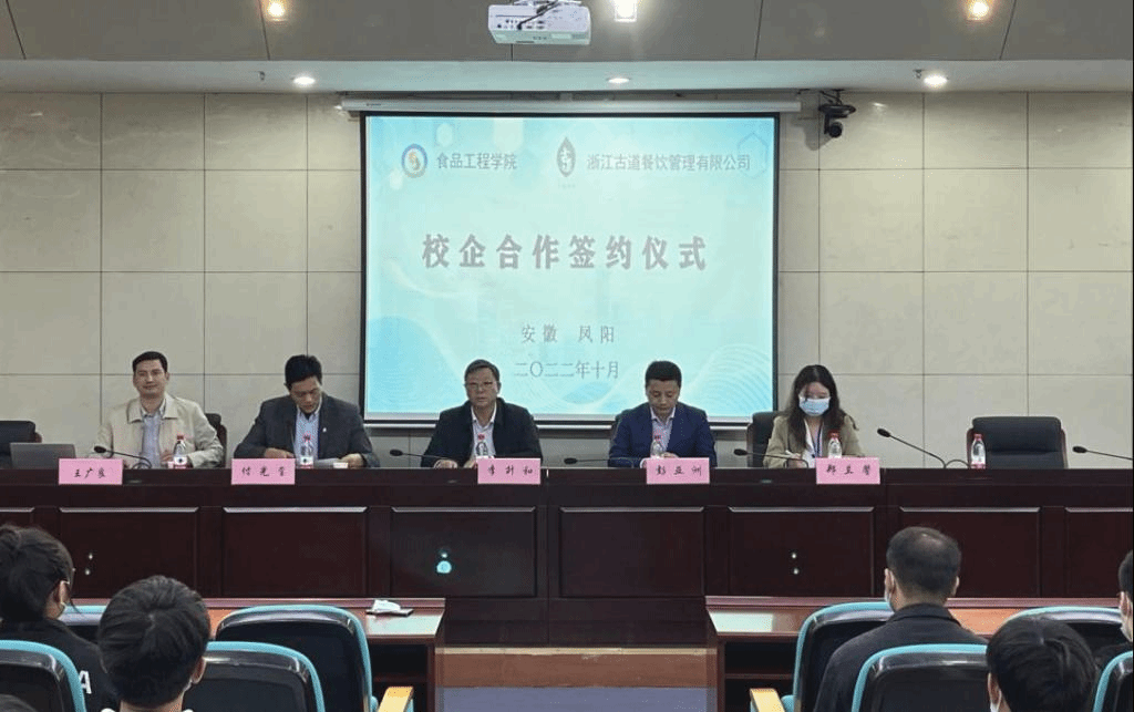 彭亚洲指出,作为华东地区有重要影响力的茶饮领导品牌,能与安徽科技学院建立深度合作关系、参与学校人才培养感到自豪,也愿意与食品工程学院一道,加快推进产业链、创新链、人才链深度融合,推动茶饮行业高质量发展,共同为中国食品产业发展作出应有的贡献。他表示,浙江古道餐饮管理有限公司将提供质量更优和覆盖面更广的合作支持,创造条件更好的合作环境,与食品工程学院共同努力,在共享共建实验平台、科研项目研发与成果转发等方面取得明显进展和成效。仪式上,校企双方共同签署了校企合作协议书。