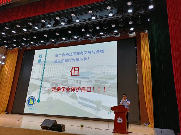 宣讲会上,蚌埠市戒毒所心理矫治中心主任刘莹以“珍爱生命,远离毒品”为题,阐释了毒品演变史、毒品种类、吸毒人员特征,利用吸毒、贩毒的典型案例与同学们进行互动,警示广大青年学生要远离毒品、珍爱生命。蚌埠市戒毒所教育科负责人朱正光以“识毒不试毒,健康不践康”为宣讲主题,结合自己工作经历,融入案例展示、情景再现,生动地讲述了青年学生如何提高识毒、防毒、拒毒、战毒的意识和能力,内容详实,事例生动,讲授深刻,并呼吁广大青年学生无论在大学校园还是今后人生的各个阶段,都要远离毒品。