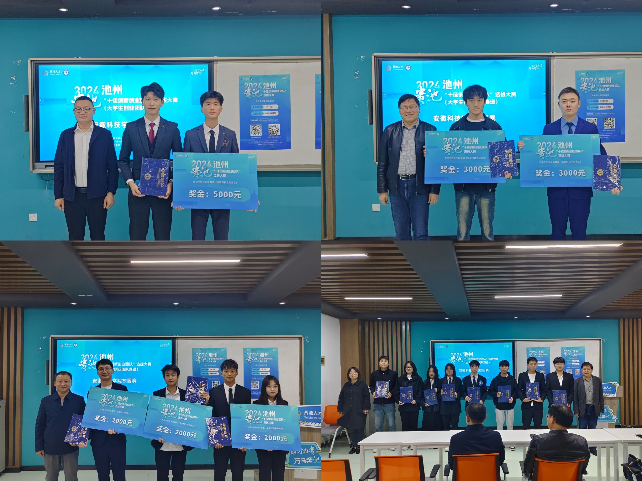 11月13日下午,池州·贵池“十佳创新创业团队”选拔大赛安徽科技学院校园赛决赛在凤阳校区落下帷幕。此次大赛由中共池州市贵池区委人才工作领导小组主办,校赛由生命与健康科学学院承办。池州市贵池区委组织部副部长张兆军,贵池区委人才工作领导小组办公室专职副主任钱伟伟,教务处副处长、创新创业学院副院长高青海,生命与健康科学学院副院长(主持工作)钱立生等出席决赛并为参赛团队颁奖。