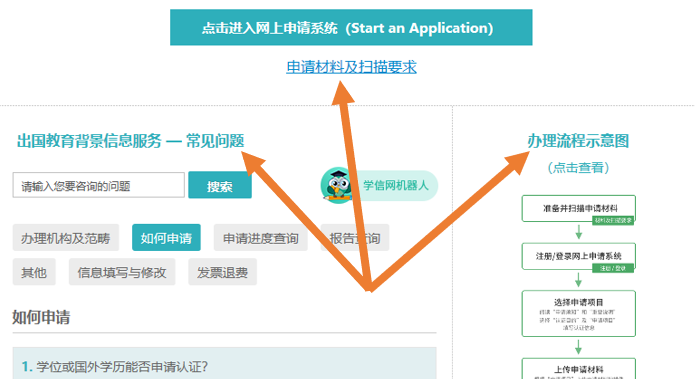 4、点击“点击进入网上申请系统(Start an Application)”按钮,按步骤操作,生成“中国高等教育学历认证报告”。