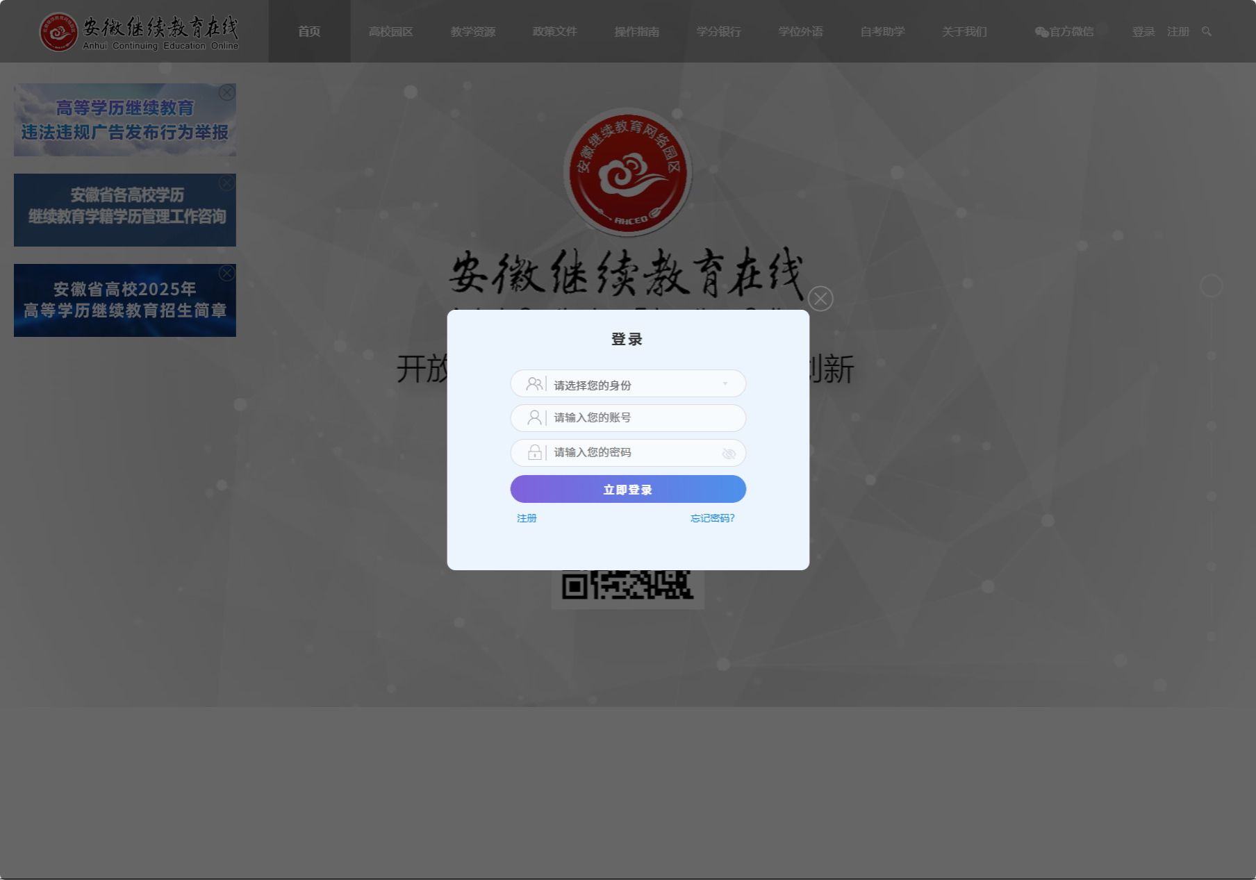 登陆安徽继续教育园区(网址www.ahjxjy.cn),登录时请选择身份为学生,账号为身份证号,密码是Jxjy+身份证后6位数,如果不显示课程,请将右上角笑脸旁边切换至安徽科技学院。