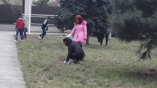 下午两点半,园林142班的同学在西区大屏幕下集合,经过简短的任务布置过程,大家人手一个塑料袋开始在规定区域内进行垃圾的捡拾。活动过程中同学们三五成群,效率很高,进展十分迅速。