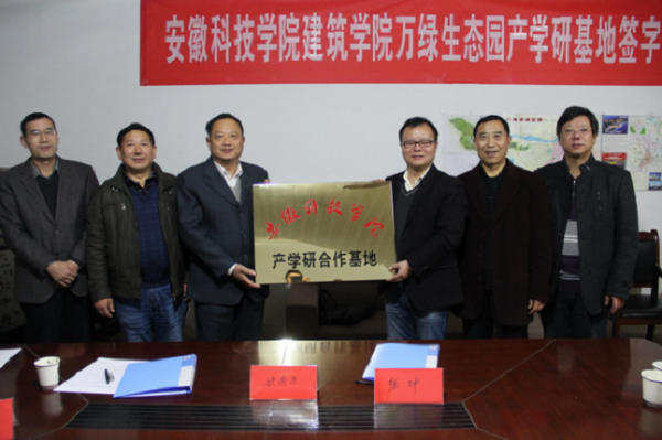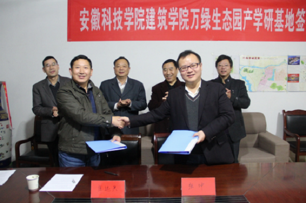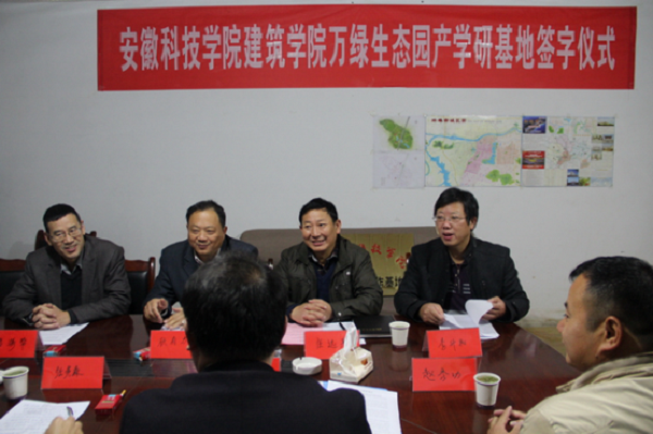 11月4日下午,我校与安徽万绿生态休闲度假有限公司及其子公司安徽万绿园林景观绿化工程有限公司举行联合培养人才、产学研合作签约仪式。校科研处处长、管理学院院长顾有方,校研究生处处长李升和,财经学院党总支书记、副院长骆海帮,建筑学院院长张远兵,设计教研室主任郑艺鸿,蚌埠市仁德房地产有限责任公司总经理张贵森,安徽万绿生态休闲度假有限公司总经理张坤、副总经理赵秀功、财务总监孟莉等出席签约仪式。签约地点设于万绿生态休闲度假有限公司,签约仪式由张远兵主持。