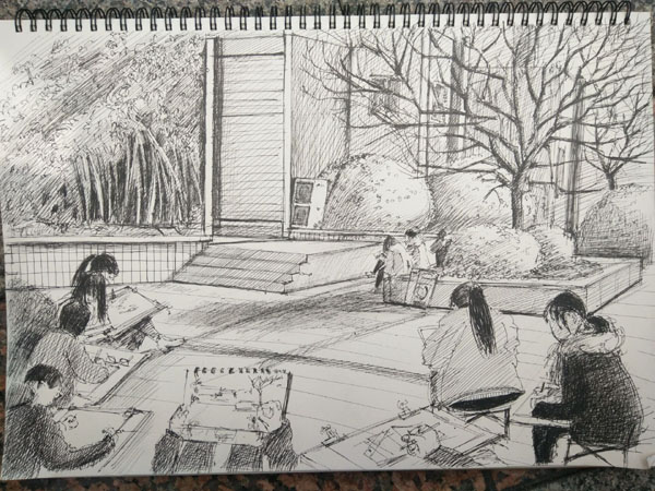 包赟同学给正在学习手绘基础的大一新生们分享他的几点手绘小窍门,手绘的第一窍门在于找准“一线一点”:“一线”指的是视平线,“一点”指的则是视觉焦点,也就是眼睛聚集的一个点;手绘第二窍门是掌握“近大远小,近宽远窄”;手绘第三窍门是选取物体比例,找准明暗与透视关系,课下勤于练习线条,临摹手绘作品,不能急于求成,日积月累自然水到渠成。