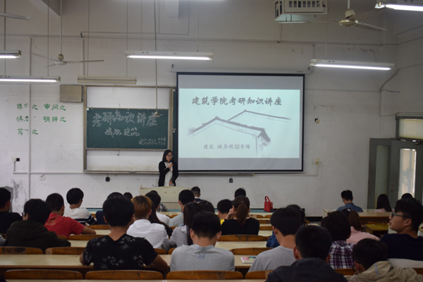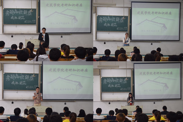 讲座伊始,耿广汉以新形势下就业为切入点,围绕“为什么考研、怎么样考研”的主题,重点强调了考研的重要性及必要性,要求考研同学要结合自身学习情况合理定位,制定复习计划,努力拼搏,不畏艰难,脚踏实地,不负韶华,成就考研梦。随后,2017届建筑学院考研优秀学子:南京林业大学园林植物与观赏园艺专业江海燕、浙江农林大学风景园林专业姚陈、苏州科技大学风景园林专业刘冬瑞、合肥工业大学风景园林专业甘振涛、安徽建筑大学城乡规划专业宁杨,他们分别结合自己的考研经历,从学校选择、时间安排、专业课复习、网上报名、考研过程心理调适、复试技巧等方面,讲述了自己考研故事。最后,在自由提问环节,考研学子针对同学们提出的问题及困惑,耐心解答。
