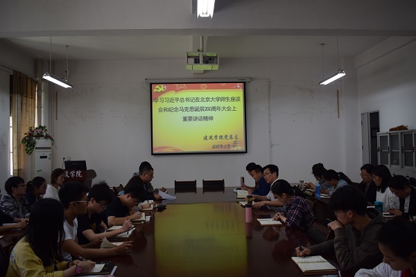 5月23日下午,为深入学习习近平总书记在北京大学师生座谈会上的讲话和在纪念马克思诞辰200周年大会上的讲话,深刻领会习近平新时代中国特色社会主义思想和党的十九大精神,建筑学院全体教职工党员和学生党员在学院会议室组织开展了“学习习近平总书记重要讲话精神”专题学习活动。学习会由建筑学院党总支书记傅友福主持。