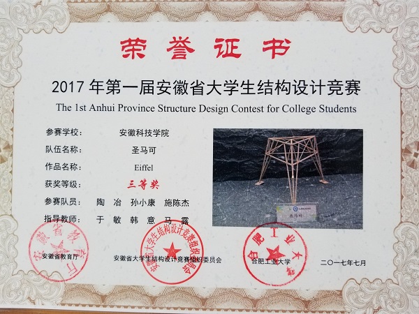 安科极光团队:曹祎,建筑学院2016级土木工程专业学生,现任班级团支书,曾获得校级优秀干部、优秀团员、三好学生荣誉称号,获得校级二等奖学金;张帅帅,建筑学院2016级土木工程专业学生,现任班级组织委员,曾获得校自律委员会优秀干事;曾杏钢,建筑学院2016级土木工程专业学生,现任班级宣传委员、校羽毛球协会宣传部部长,曾在2017年全国中学生羽毛球锦标赛中担任志愿者。该小组在安徽省第一届结构设计竞赛中获得三等奖。