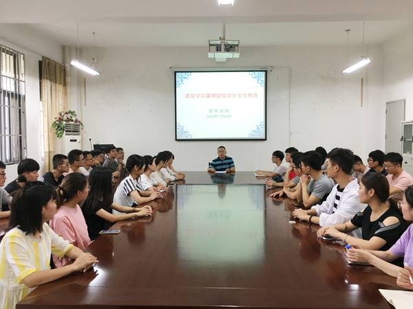 张海仲通报了建筑学院2018年学生留宿整体情况、学生集中住宿具体分布、临时寝室长全体名单、临时班级班委会组成成员,重温了《2018年暑期留校住宿学生安全承诺书》和《防溺水“六不要”安全承诺书》全部条款。