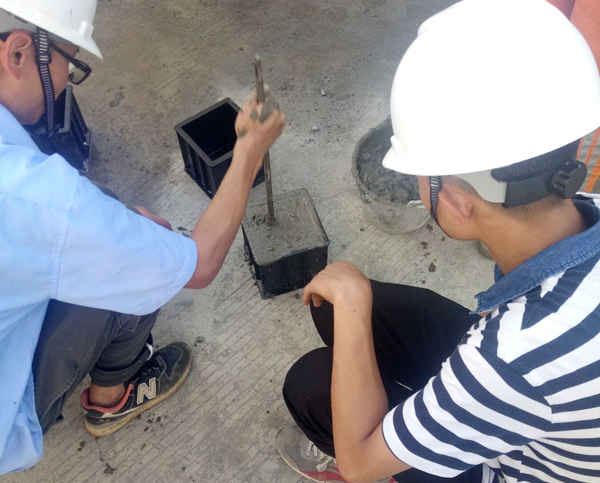 炎炎夏日,热浪袭面。在中建四局第六建筑工程公司承建的万福花园项目部工地上,一群头戴安全帽的土木工程专业学子们,他们不畏烈日,顶着酷暑,有的在检查底板钢筋,有的在做混凝土回弹实验,有的在测定U型卡尺规范性,有的在做混凝土质量检测……一丝不苟的态度,任劳任怨的作风,生动诠释了土木人特有的“务实”和“执着”。他们就是建筑学院2016级土木工程专业在企业实习的学生。