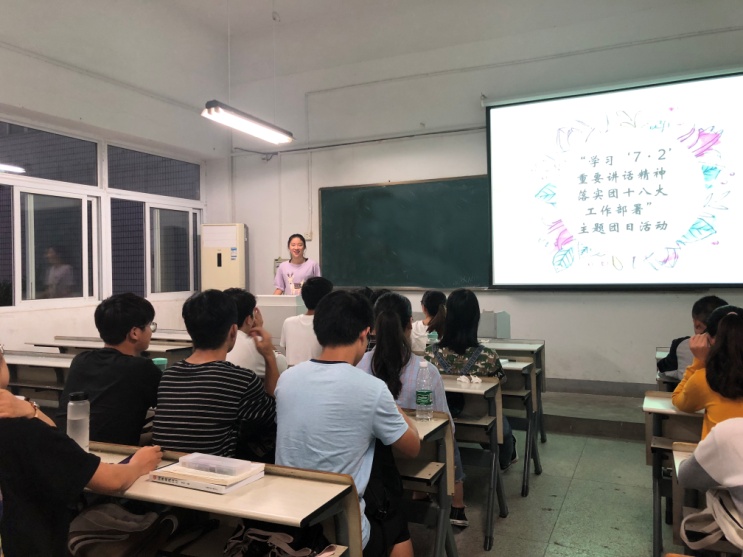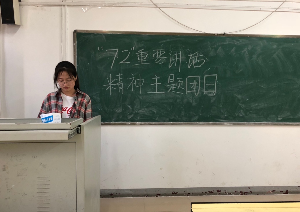 首先,团支书向大家汇报了此次活动的主旨和核心,及时传达了上级团委的重要指示。本次活动主要以学习座谈会的形式展开,接着通过一组图画来学习领会习近平总书记“7.2”重要讲话精神。让同学们深刻体会到不仅要牢固树立“四个自信”,切实增强“四个意识”,还要始终在思想上政治上行动上同以习近平同志为核心的党中央保持高度一致。