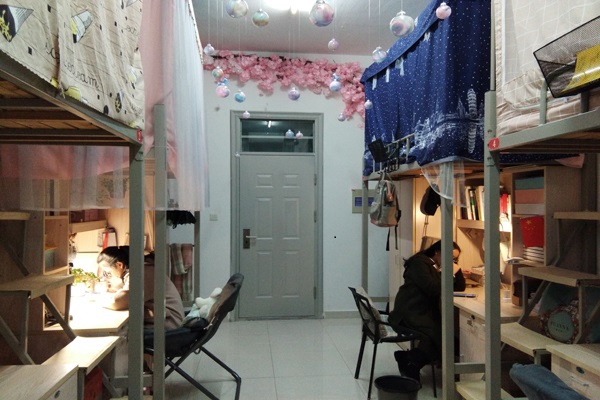 17:00,评审团走进各个宿舍进行评分,同学们的寝室装扮风格迥异,有浪漫樱花风、可爱动漫风、活力运动风、唯美古风、清新素雅风,有的寝室贴上了励志标语表达了他们对美好大学生活的希冀,有的寝室设置了照片墙,记录他们大学