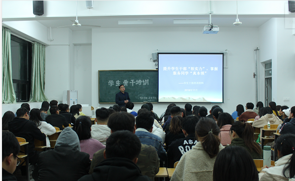 为加强学生干部队伍建设,提高学生骨干综合素质,更好地适应新形势下学生干部工作的实际需要,建筑学院和管理学院于11月21日在龙湖校区致知楼B109联合举办了2019年学生骨干培训班。此次培训由管理学院党总支书记姚勇主讲,管理学院辅导员段世祥、建筑学院辅导员沈德艳以及管理学院和建筑学院全体2019级学生干部参加了本次培训。