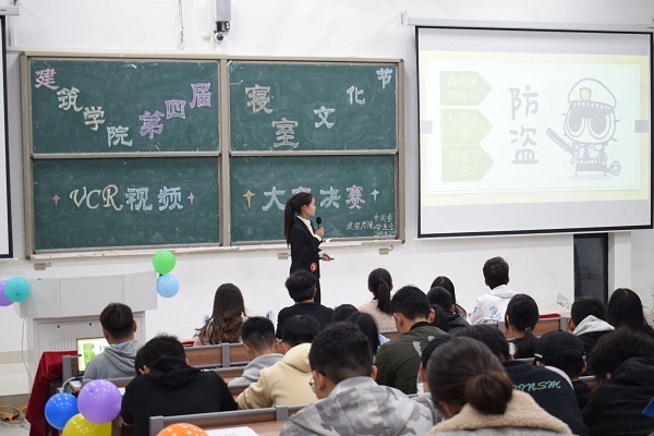 为了进一步加强学生寝室安全文明建设,营造温馨舒适的寝室环境,11月23日晚,建筑学院第四届寝室文化节之“安全寓你同行”VCR视频大赛决赛于致知楼B111举行。此次大赛由建筑学院学生会指导老师阮怀思、校自律委员会主席周忠华、财经学院学生会主席付正阳、化学与材料工程学院学生会主席程家强、建筑学院学生会主席王海燕担任评委。