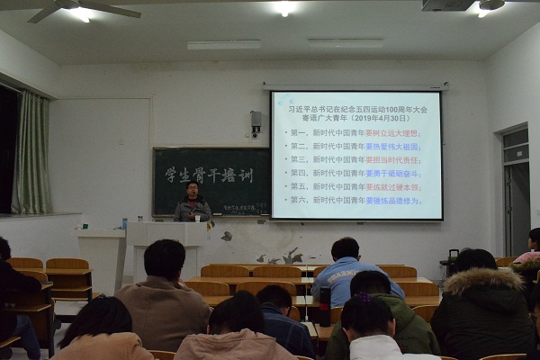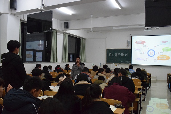 为进一步提高学生干部自我教育、自我管理、自我服务的能力和水平,增强学生干部的责任担当意识,推进学生工作扎实开展,管理学院和建筑学院联合举办了2019年学生骨干培训班。12月2日晚,第三次培训在致知楼A108举行,学生科科长兼学生处秘书石志成担任主讲,管理学院辅导员段世祥、建筑学院辅导员阮怀思以及管理学院2019级和建筑学院2018级全体学生干部参加了本次培训。