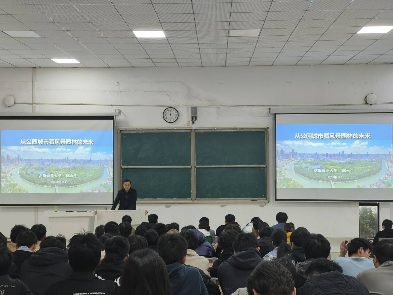 11月22日下午,安徽农业大学风景园林系主任、国家一流园林专业建设负责人,安徽省风景园林学会副理事长,教育部科技成果评审首聘专家陈永生教授在安徽科技学院龙湖校区致知楼C111为我校师生作题为“从公园城市看风景园林的未来”的学术报告。报告由建筑学院风景园林系主任王雪娟主持。