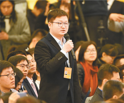 3月15日,国务院总理李克强在北京人民大会堂与中外记者见面,并回答记者提问。图为人民日报记者徐隽在提问。人民日报记者 李舸摄