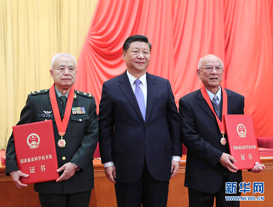 1月8日,2018年度国家科学技术奖励大会在北京人民大会堂隆重举行。中共中央总书记、国家主席、中央军委主席习近平向获得2018年度国家最高科学技术奖的哈尔滨工业大学刘永坦院士(右)和中国人民解放军陆军工程大学钱七虎院士(左)颁奖。 新华社记者 谢环驰 摄